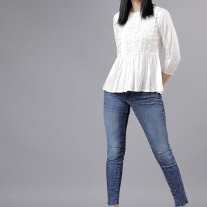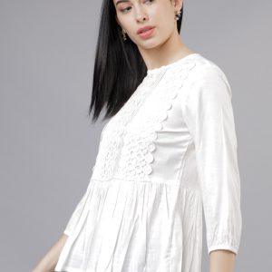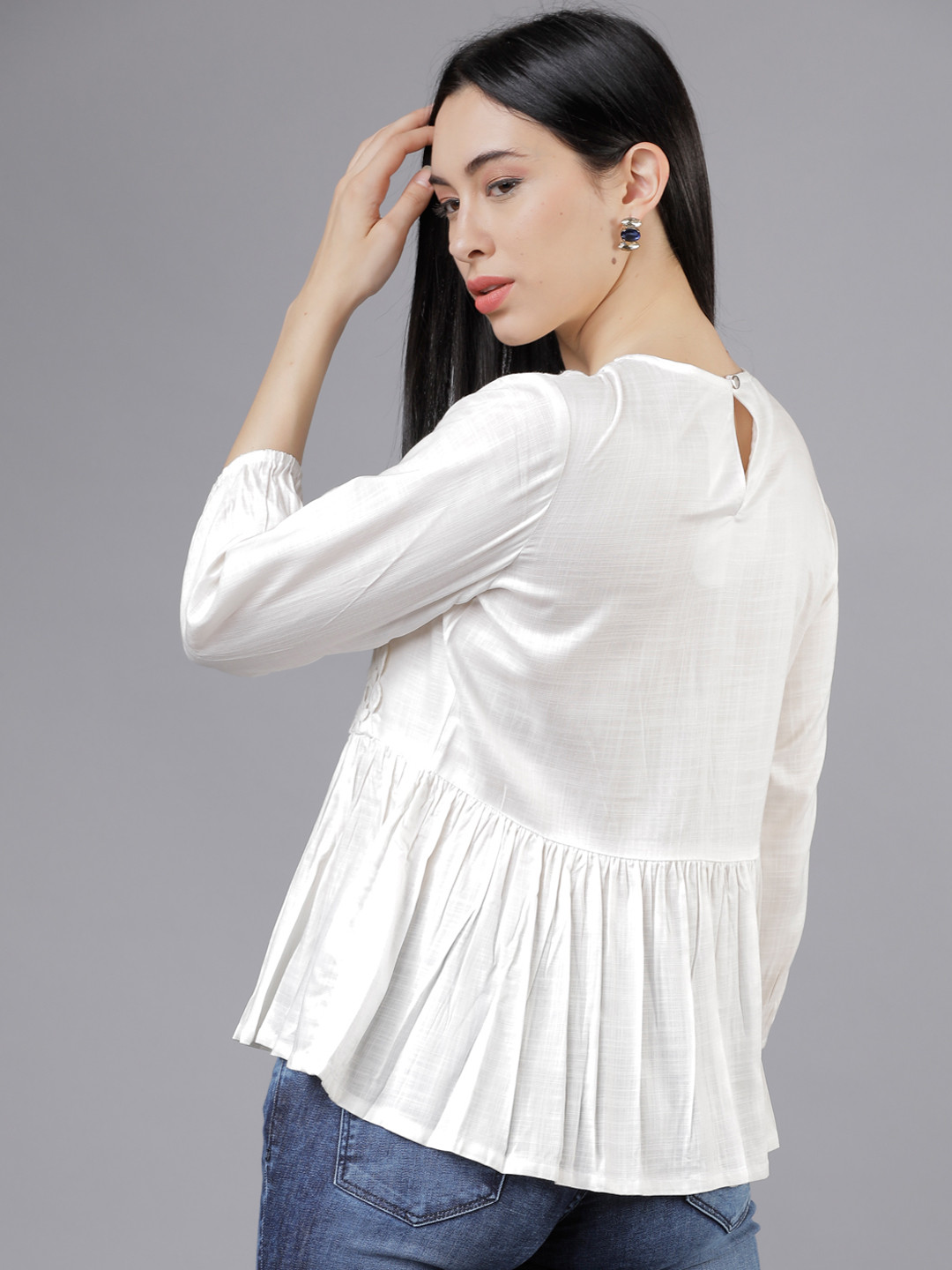 This white peplum top features a clean, solid design with a flattering silhouette.